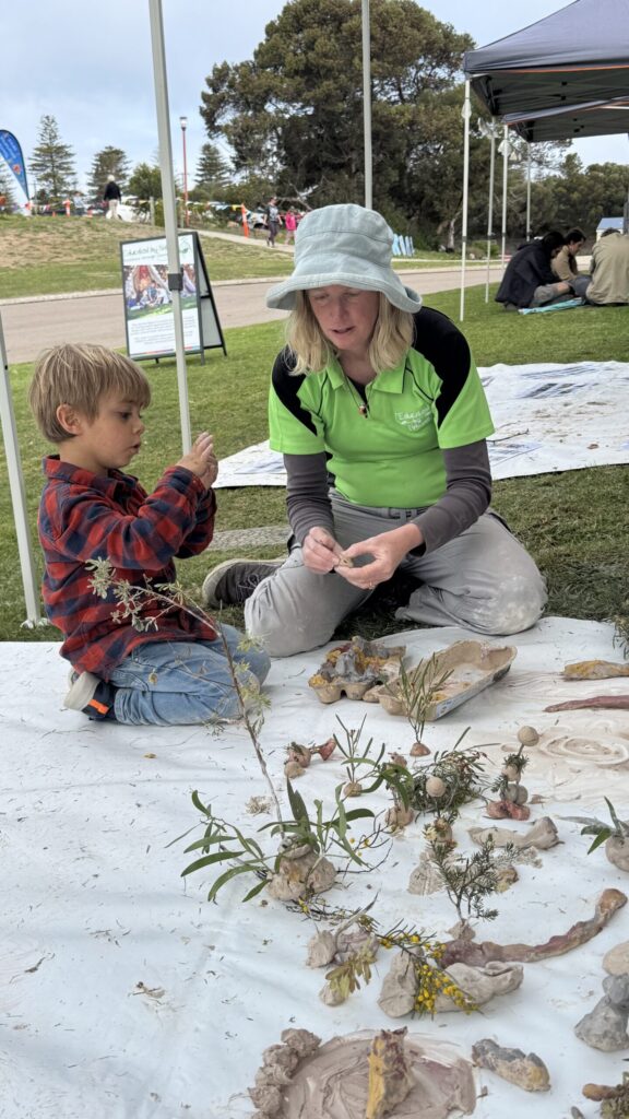 Their guidance meant that our clay creatures and wildflower artworks were not just decorative, but connected to Country – to real animals, habitats, and ongoing custodianship. This partnership helped children see beyond the festival tent, into the living systems that support us all. Conversations with the Rangers sparked questions about caring for these ecosystems, understanding seasonal shifts, and respecting the knowledge embedded in local landscapes.