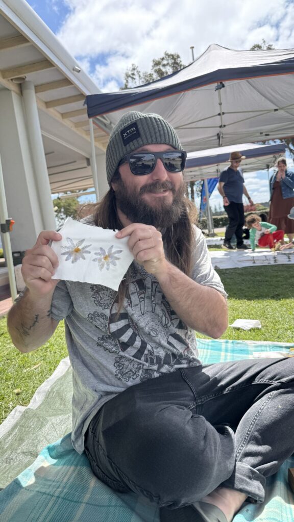 A quieter festival also created unexpected permission for adults. Around the Happa Zome space, parents and grandparents lingered longer, chatting with us and with each other. One woman reflected, “I used to pick flowers from my grandma’s garden and make potions. I’d get in trouble. Now here I am, making beautiful artwork from the petals of flowers.” These moments wove memories and present experience together, allowing adults to reconnect with the creative, playful parts of themselves often left dormant.